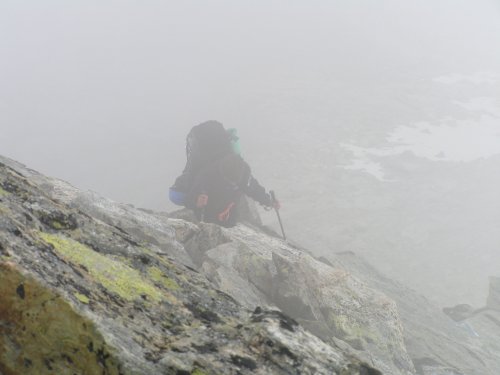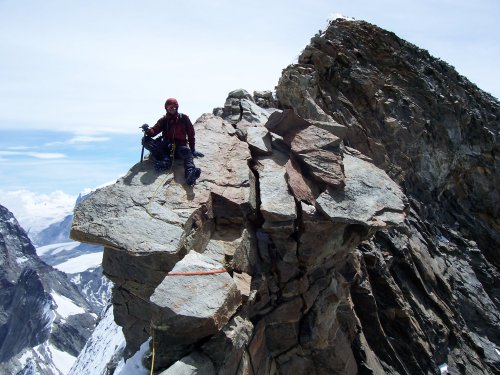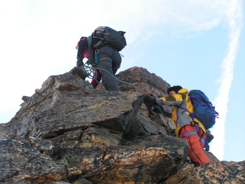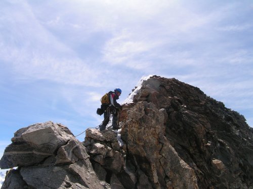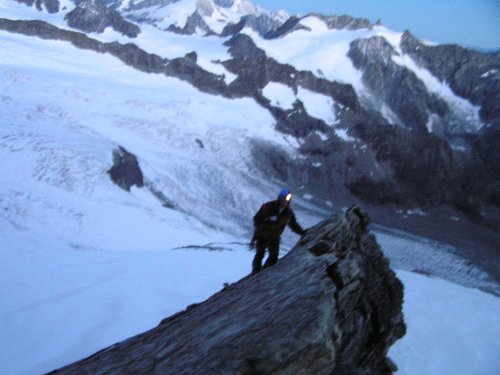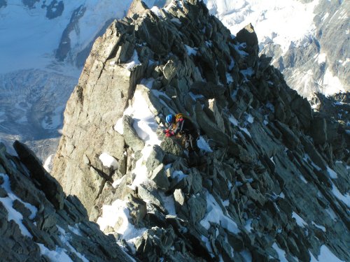 Cesta ale nečeká a my nastupujeme teď již opravdu do jižního hřebenu hodnoceného stupnicí AD s lezeckými místy až III+. Začátek není nikterak těžký, a tak lezeme každý sám změtí kamení, skála se ale s přibývající výškou stává čím dál více kompaktní -- a také těžší. Okolo 7:00 stojíme pod hrozivým hlídačem, věží Grand Gendarme.
