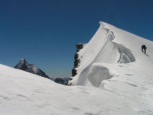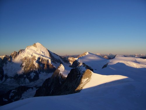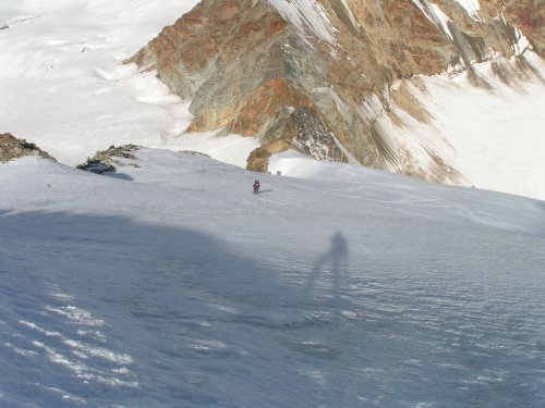 Nakonec se ale s úspěchem chvilinku po svítání vyškrabeme na kupu sněhu zvanou Wanfluelucke 3701m vysokou. Je krásné počasí téměř bez větru a máme odtud přehled o celém Schoenbielském údolí, vidíme Matterhorn celý v červeném, Dent d´Herrens a v pozadí celý masiv Monte Rosy.