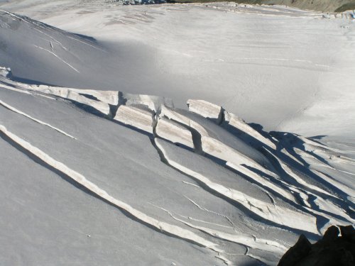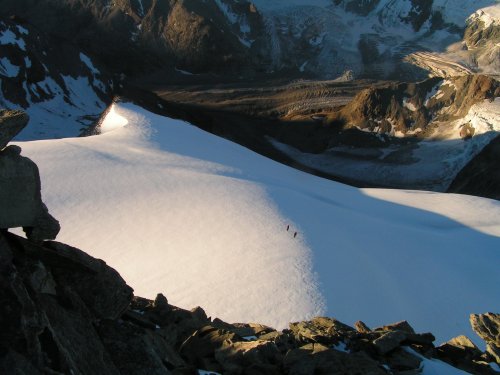 K našemu dnešnímu cíli, základně pro výstup jižním hřebenem bílého zubu, kabině de la Dent Blanche (3507m), je to ještě něco přes 1000 výškových metrů. Jdeme hodně natěžko i se stanem a spacáky, takže se nám nestoupá vůbec dobře. Brzy přicházíme k ledovci zcela zasypanému sutí a přes pěkně vymodelované ploché plotny nás vede pěšinka značená mužíky jižním směrem ke skalnatému hřebínku Roc Noir. Ten nás pak směřuje až do oblak na ledovou planinu pod chatu.