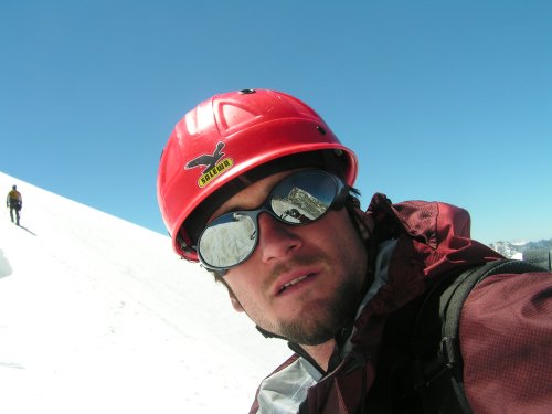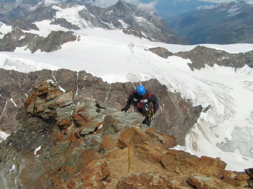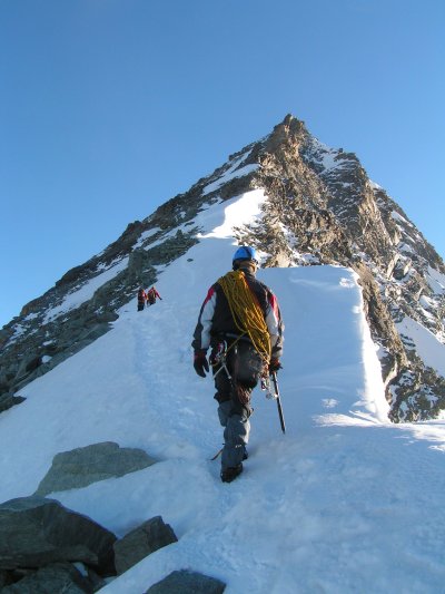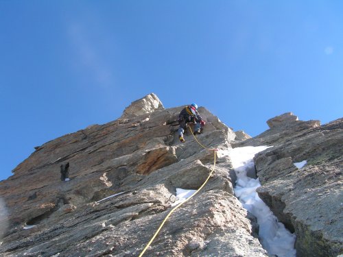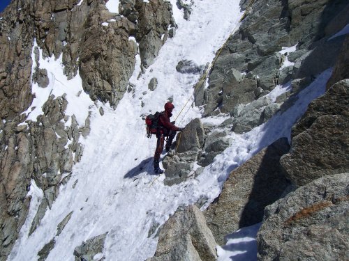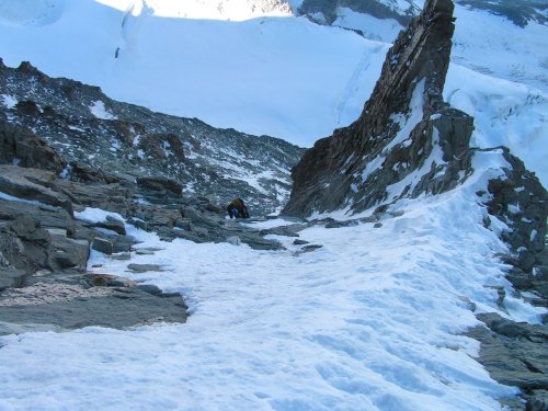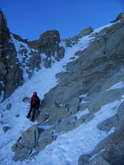 Přímo by to mělo být za IV, my ale stejně jako všichni ostatní obcházíme hlídače zleva sněhovým kuloárem. Ten zespoda vypadá v pohodě, takže se rozhodujeme lézt stále volně. Toto rozhodnutí proklínám v jeho horní zledovatělé polovině, kde se po pekelném traverzu poněkud vystresován štanduju u pěkně zasazeného nýtu. Jen tiše pak držím palce Jendovi, který se stejnými problémy jako já zběsile buší do kuloáru pochybné struktury. Vše nakonec dobře dopadne, navazujeme se a postupujeme dále nad Grand Gendarme, to už ve výšce 4000m.