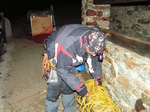 Ráno tak není rozhodně moudřejší večera, ale nepohrdáme snídaní s obrovským šálkem kafe a jíme tak dlouho, až vycházíme z chaty jako poslední okolo 5:00, což je opravdu pozdě. Nástup začíná hned za chatou, někdo zahajuje za záchodky, někdo za sudem. My volíme levou sudovou variantu a vůbec nejsme moudří z toho, kudyže je to nejjednodušší.