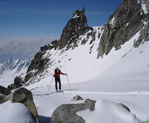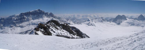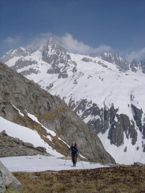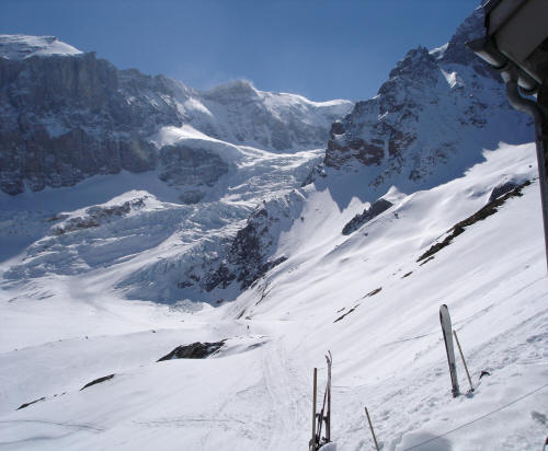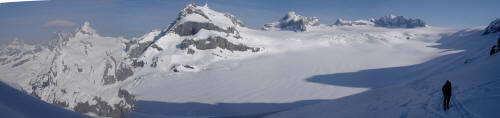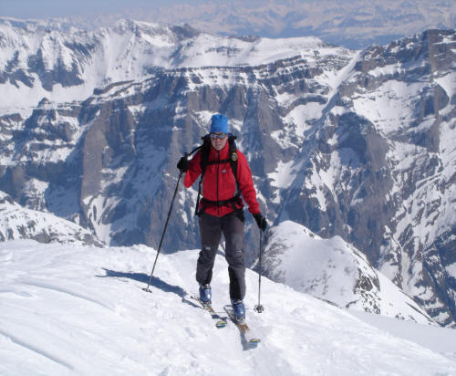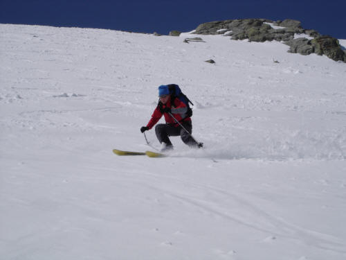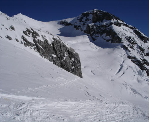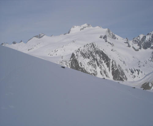 Za sedlem je jíž vidět ledovec Bifertenfirn vedoucí na Tödi a vláčky lidiček s lokomotivou vůdcem, táhnoucích se z údolí na druhé straně. Vrchol je zážitkem - panorama 360 stupňů. Vzhledem k množství lidí volíme rychlý sestup. Sníh je krustovatý, ale přesto carvingové lyže jedou jak v prašanu. Pro sestup volíme cestu přímo ledopádem, ač většina s vůdci jede vlevo kuloárem Schneerus. Ledopád je spíše psychicky namáhavý než technický, chyba by se zle nevyplatila a pohled na seraky nad hlavou nepotěší.
