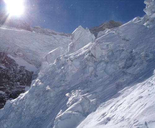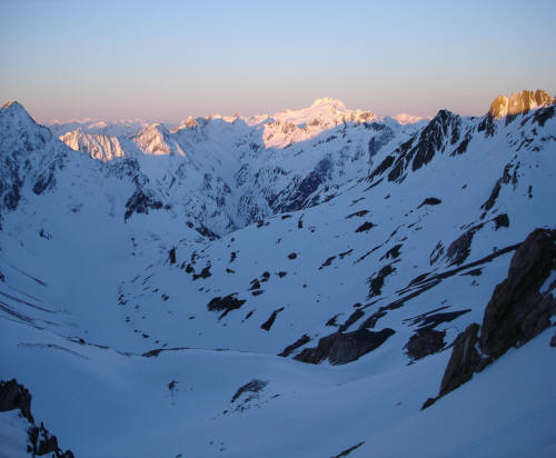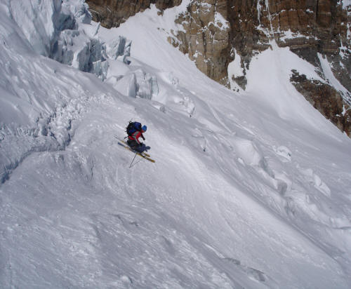 Za svítání jsme na sedle, zamrzl mi Camelback, a záda jsou studená. Musí být pořádná zima, neb kalhoty a bunda jsou jak pancíř. Lenka dochází a diví se mému sakrování. Camelback nebyl zamrzlý, ale škubáním za hadičku jsem si dva litry isostaru vylil do batohu, na záda, zadek a kalhoty. Oloupu sladké krystalky a vyrážím dál sjezdem na ledovec Gliems. Ostrým stoupáním se dostáváme pod sedlo, na posledních 50 metrů sundáváme lyže a jdeme pěšky s cepíny.