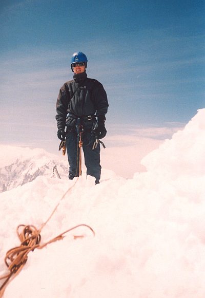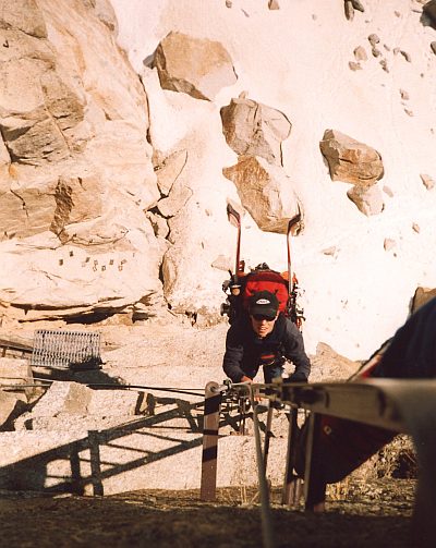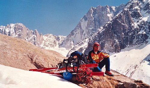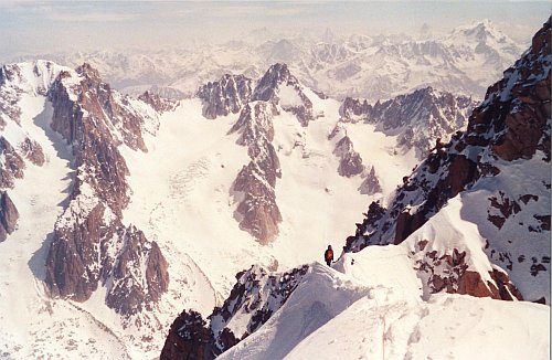 Ráno balíme všechno to harampádí a přejíždíme na parkoviště u lanovky na Montenvers, kde necháváme auto. Kolem jedenácté vystupujeme na horní stanici spolu s desítkami turistů – fotografů. Lyže a sněžnice putují na bágly a my absolvujeme pikantní žebříkový dvě stě metrový sestup na ledovec Mer de Glace. Tam opět nasazujeme naše sněžné vehementy a pomalu ukrajujeme z našich dnešních 11-ti set metrů převýšení na chajdu Couvercle. Slunce pálí a proti nám jezdí davy lyžařů, které vyvrhla ve čtyřech tisících lanovka na Midi a užívají si sjezd celým údolím Vallé Blanche. Jde se dobře až do místa, kde ledovec zatáčí doprava. Tam totiž odbočujeme z vyšlapané stopy doleva a pokračujeme svým směrem. Kličkujeme mezi trhlinami a sutí. Ledovec nás každého varuje, když oba postupně propadáme nohou do trhliny. Je čas se navázat…pokračujeme bez lyží a sněžnic…cesta je zdlouhavá, několikrát se vracíme a hledáme lepší cestu mezi trhlinami. Slunce už je kolmo nad ledovcem a nemilosrdně smaží, ….křuuup…zapraská si pod námi sněhový most. Jó, ledovec si žije vlastním životem. Mastíme, co nám síly stačí, nechceme ten nepříjemnej zvuk slyšet znovu…Za chvíli jsme pod skalní stěnou, kterou je třeba vystoupat k chajdě. Vidíme pár týpků, jak slaňují po žebříkách dolů…tak to bude zase mazec. Ne nadarmo v průvodcích píšou, že přístup na chaty v oblasti Blancu je většinou náročný, jako jinde celá vrcholová tůra. Nás čeká asi dvě stě metrů „železnýho štajgu“, který by někde v Rakousku byl snad za D, tady se ale jedná o normální turistickou cestu…Děláme si alespoň dvě odsedky a rychle nabíráme expozici….30m žebřík…přelez po kramlích do rokle…pár metrů šplhu po konopným laně a zase žebřík…a tak pořád dokola…s báglem a lyžemi docela taškařice.