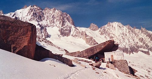 V parádní plechový boudě pod obrovským placákem jsou už zabydlený tři frantíci – skialpinisti. My se uvelebujeme v menší místnosti, kydáme bordel z batohů, vaříme, pijeme a kocháme se parádními výhledy….severní Jorassy máme jak na dlani, celý hřeben Chamonských jehel až po Mt. Blanc taky, no to je fantazie… S mapkou v ruce se snažíme rozpoznat všechny ty vrcholy a vrcholky….je jich tu tolik…Partička žabožroutů jde na Pte Elizabeth, vstávají prý ve čtyři….jenže my už ve dvě – héč, takže hybaj ještě za světla na kutě!!!