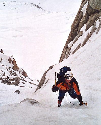 Dost tu fičí, jdu opatrně hřebenem dolů, předvádím učebnicové zakopnutí o mačku a po zádech parakotoulem letím z hřebene na sever…v podvědomí jsem tak nějak klidnej a jistej, že mě Jarda chytí, …. ( v reálu jsem prý řval jak tur ). Spolehlivej Jarouš mě chytá přímo do teplejch, jó jsem holt lehká váha. Zastavuju se tak pět metrů pod hřebínkem, vzpamatovávám se a krásným ledíkem se škrábu zpátky k parťákovi...pokračujeme…V sedle dopíjíme zbytky pití a začínáme nekonečné slanění k nástupu…je jich asi 15…Dole jsme za tři hoďky, chumelí, rychle vše balíme a valíme dolů na chatu. Já si užívám sjezd v hlubokém mokrém sněhu, Jarda cupitá v tý kejdě na sněžnicích. V sedm stojíme zase před chatou a náš dnešní maratón končí…jsme spálený na maděru, unavený jakbysmet, ale hlavně spokojení… Spát jdeme opět brzo, máme toho dneska fakt dost.