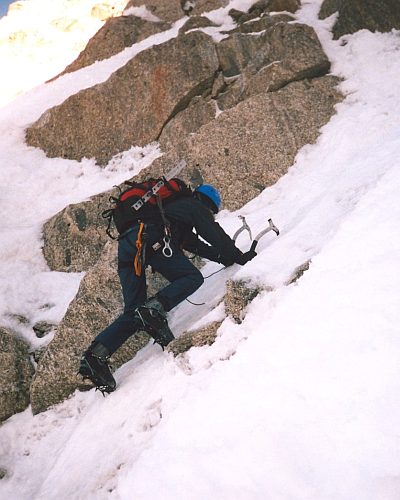 Je fajnově umrznuto, lehce pod nulou…čekali jsme daleko větší kosu. Ťapeme za svitu čelovek po starých stopách, s orientací není problém. Jen z východní stěny Aig. Du Moine je vysypána spousta malých lavin a každou chvíli musím sundávat lyže. Jarda si na sněžnicích jde jako král…Po dvou hodinách stojíme pod nástupem „naší“ cesty. Právě svítá a my nastupujeme….první metry laviništěm, pak odtrhovka a už nalézáme do spletě úzkých žlábků…paráda, přesně takhle jsem si to představoval. Sklon tak 50°, perfektní firn, místy jsou žlábky krásně vyledněný – ouplná euforie.
