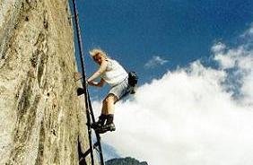 Druhá část cesty vedla stále ještě po pláni na Glacier de Bionnassay, kde nás u turistické chaty požádal nějaký cizinec ať napíšeme na kus kartónu přání všeho nejlepšího jeho dívce k narozeninám v češtině. Odchytává takto všechny kolemjdoucí a tak už má na fotkách tohle přání v několika jazycích. Přicházíme ke skalní stěně, do které je uchyceno ocelové lano. Oblékáme sedáky a přivazujeme se k němu.