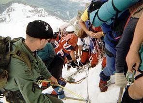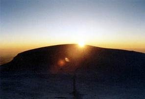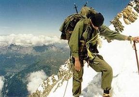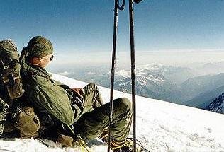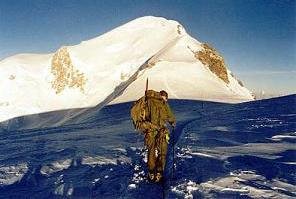 Vyrážíme dál. Končí lezecký úsek, před námi je "už jen" planina. Přivazujeme se navzájem na lano a jen co noha nohu mine míříme k vrcholu. Michal vzadu sotva supí, já vepředu jsem na tom jen o trošku lépe. Slunce pálí, je aspoň 30°C. Jde se čím dál tím hůř. Srdce nám tepou jako splašená a před očima se míhají mžitky. Na Dome du Gouter (4.304 m.n.m.) se rozhoduji uvařit si aspoň polévku, protože se silami jsem na konci a cítím, že potřebuji něco do žaludku, aby měl organismus z čeho čerpat. Michalovi to vůbec nevadí, zhroutil se na sníh a možná spí. Sundal jsem jednu mačku, zasekl ji do sněhu, na ní rozevřel liháč, což mě nevýslovně vyčerpalo, a asi hodinu ohříval dvě deci vody. Když mi došlo, že v této nadmořské výšce ji opravdu k varu nepřivedu, vsypal jsem do ní polévku a pomalu polkl první sousto. Nevím, zda stihlo dojet až do žaludku, ale vím, že bylo v ten moment vedle mě na sněhu. Zbytek jsem vylil a pomalu vydoloval mačku, která se tím teplem propadla asi půl metru do sněhu.