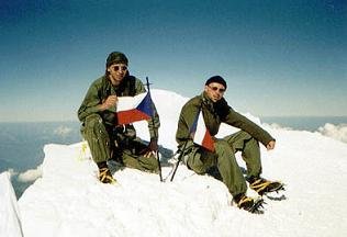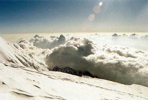 Poslední metry vedly po krásném a úzkém hřebeni, na jehož konci jsme se s Michalem chytli kolem ramen a na vrcholek nejvyšší hory Evropy jsme vstoupili společně. Byli jsme tu úplně sami. Aspoň chvilku. Pohled dolů byl impozantní. Pod námi plula bílá oblaka a z nich vystupovaly vrcholky hor, bylo vidět, jak je obzor kulatý. Zamávali jsme českými vlaječkami do objektivu fotoaparátu a pomalu začali pomýšlet na návrat.