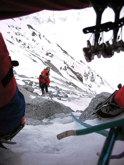 Nástup bol spoločný s viacerými cestami, ktoré sa po približne päťsto metroch rozdeľujú. Až potiaľto bolo lezenie v parádnom tvrdom ľade. Náš výstup sa oddelil nad trojuholníkovou stenou a pokračoval medzi skalami hlbokým snehom na pilier, ktorým sme križovali na strmé ľadové pole. Tam sme zriadili prvý bivak.  Mysleli sme, že to odtiaľto dolezieme až na vrchol a zostúpime ešte v ten deň, ale prekazila nám to strmá stena, ktorou  sme liezli ďalej. Tenký trieštivý ľad nalepený na skale alebo len snehom posypané police a pod nimi hladké platne.