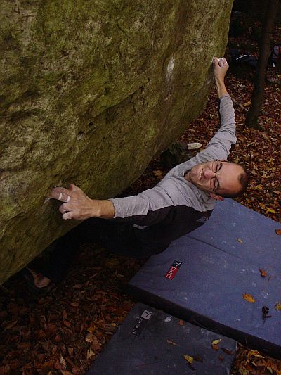 Vymrzlé ze soboty jsem kluky (Martina Pelikoše a Rosťu Štefánka) přemluvil, že Blechfass je super skála a na slunci, tak jsme tam jeli. Na slunci by teoreticky mohla být nebýt hustého stromoví, navíc po rozlezení, když se Rosťa chystal na nejtěžší cestu na téhle stěně, se přihasil nějaký němec, vyzařovala z něj aura lezeckého pána boha, bez okolků jsa značkově vybaven a s pohráním ke světu, hup do cesty Pumpgun, nedbaje, že je Rosťa již pod ní přichystán. No dobře aspoň uvidíme, zřejmě někoho z německýho manšaftu v akci. A nic. Sedí hned v prvním místě kde to trochu zhoustlo. Pak dál a dál dřepí už bere za expresky a prasí to, jak to jde.