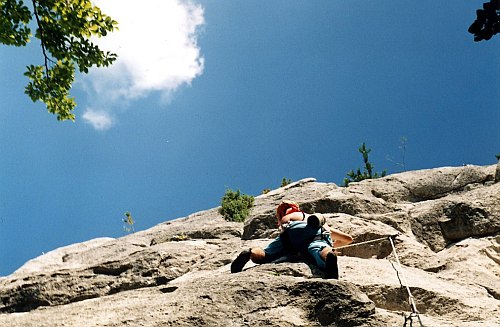 Už sa ledva držím na chytoch sú oblé a mne naozaj dochádzajú sily. Prečo ja somár som nešiel po tej špáre mala iba 3 metre mohol som ju nejako prejsť a potom mohol byť kľud. Naučím sa liezť špáry sľubujem, len nesmiem teraz padnúť nie pred zlaňákom. Musím zapnúť tento posledný borhák a trošku si poprášiť ruky a doliezť túto cestu. V hlave som si to nejako usporiadal a cvakol posledný borhák. Ideme ďalej. Ešte tri kroky a som tam. Nadávam a snažím sa predýchať posledné kroky. Držím nejakú blbú oblinu a snažím sa cvaknúť zlaňák. Stále sa držím a nejako trvá pokiaľ mi dôjde že si môžem pokojne zarevať smerom dole a odsadnúť. Ako prvé čo spravím poriadne tie hovädá čo sa na mne bavili dodrbem. Hajzlíci a vraj kamaráti. Chvíľu posedím hore a potom zlaním. Dole zisťujem čo som vyliezol. Nebola to žiadna 6/6+ ani 7- ale rovno za 7 a k tomu OS. Brácho sa smeje a chalani radšej odišli do bezpečnej vzdialenosti. Už nemám chuť vynadať nikomu, som rád, že ma posunuli o stupeň vyššie.
