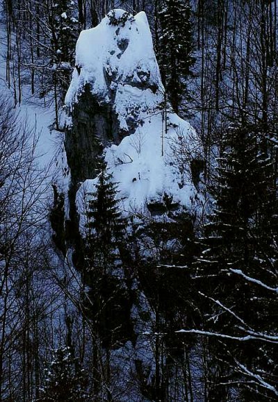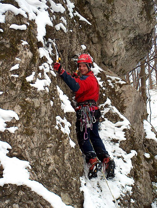 Po ďalšej cigarete vyrážame do prvého snehovo ľadového poľa, ktorý v skutočnosti je skôr žľabom ako poľom. Ale takýchto miest zo snehom je v stene naozaj málo. Sneh končí a žľab sa dvíha a zužuje. Sneh sa na skale neudrží. Krátka položená platňa nás doviedla k Božskej špáre. Tá je naozaj super, lebo sa dá dobre odistiť a aj keď je kolmá, preliezame ju celkom rýchlo. Špára končí na Polici pri suchom strome. Tu sa dá dobre oddýchnuť, lebo nás čaká nepríjemný Obrovský kút, ktorý začína malým bruchom. Tu začínajú ťažkosti ale dá sa. Kút nás dovedie do Jaskynky, ktorá je malá a nedá sa v nej ani trochu oddýchnuť, iba ak by ste boli nejaký vtáčik. Skala je kolmá až mierne previsnutá a mne začína byť zase horúco aj keď je pod nulou. Mačky škripocú a zúfalo sa snažia ustáť na malých skalných stupoch. To už som v traverze. Nazvali sme to Božský traverz, lebo je  to naozaj pekné lezenie ktoré nás dovedie k ďalšej špáre, tentoraz je to Ťažká špára. Je mierne previsnutá a strašne vypľúva, stupy skoro žiadne a na zbrane ďaleké prešahy. Často ani neviem na čom tie hroty vlastne držia. Ešte jeden ďaleký prečah, riadny náprah a zbraň konečne dobre drží v tráve, ktorá je super premrznutá. Konečne niečo, čo dobre drží, ešte druhú zbraň zaťať, trochu oddýchnuť a vyliezť na Policu spásy. Polica je super. Dá sa na nej stáť len tak tak, ale človek môže vyklepať ruky a poutierať pot poprípade vytrieť zadok J. V prípade, že vás zastihne tma, tak tam môžete zabivakovať po sediačky. Dá sa tu aj dobre zaistiť a tak sa môžem sústrediť na najťažšiu pasáž tejto cesty. Bol by som veľmi rád keby som túto Fucking škáru mal za sebou, ale ja som stále na Polici spásy. Po naozaj dobrom oddýchnutí začínam liezť, alebo lepšie povedané, bojovať zo zemskou príťažlivosťou, strachom, teplom na tele a zimou na prstoch. Je to naozaj zaujímavý úsek. Skala je tu bez stupov a chytov, ak nerátam špáru. Stojím na trenie (tí čo stáli mačkami na trenie vedia čo hovorím) a zbrane mám len v jednom chyte a tým je spomínaná škára. Viem ako mám robiť nasledujúce pohyby, ale strach, alebo čo to je, ma vrátil späť na policu. Znovu odfukujem a dodávam si odvahu tým, že minule som to preliezol ale len tak tak. A tak mi rešpekt zväzuje moje pohyby. Znovu skúšam. Teraz som sa dostal o kúsok ďalej a viem, že to už musím dať, lebo vrátiť sa môžem len vzduchom Nohy na trenie !!!!! zbrane v špáre, kde je diera a v tej mám obidva hroty, nadýchnuť a nohu dať pod seba na hranu škáry, kde je stup na jeden hrot aj to len pár milimetrov. Postaviť, druhá noha vo vzduchu a snaží sa na niečo postaviť, no ale aj tak ju nechám len tak visieť. Na pravej zbrani fixujem a ľavou sa snažím čo najvyššie našmátrať malú poličku. Už ju mám. Dám tam aj pravačku a dvíham sa aj keď neviem, či mi zbrane nevyletia a nepošlú ma pod policu Spásy. Zatiaľ držia a ja sa snažím zachytiť hrotom, čo najvyššie, ale nedarí sa. Ľavačka puchne. Konečne mi drží aj druhá zbraň aj keď neviem na čom drží. Nohy musím dať teraz až ku zbrani na tú maličkú poličku, čo je pre mňa ťažké, lebo som tvrdý ako poleno. Teraz som vykrútený ako paragraf, trochu odfukujem a snažím sa zaistiť. Napadlo ma, že minule som práve tu odsadol, lebo som nemal síl zapnúť laná do karabíny. Dnes si dávam lepší pozor a tak sa snažím dostať do tráv, ktoré sú nad týmto Kľúčom (tak sme to nazvali) a až potom sa zaistím. Bingo !! dnes sa to podarilo a už len nezazmätkovať. Som zaistený, zbrane v trávach a teperím sa cez toto brucho na druhé snehové pole. Až tu si poriadne vydýchnem a dám si znovu rukavice. Teraz nás čaká ešte jeden problém a to je Vrcholová stena, alebo tiež  Hlava. Je to kolmá stena, ale už s chytmi pre zbrane aj so stupmi pre mňau, mňau, ale aj tu sa dá ešte spadnúť. Za chvíľku to preliezame a teraz už len vychutnávame na vrchole pocit.... Aký? Hľadám slová, ale myslím si, že netreba a že tých pár šialencov ako som ja, vie čo chcem povedať. Výstup končí zostupom a tak po cigaretke hádžeme dole laná a celou cestou zlaňujeme. Takto môžeme  ešte raz vychutnať pocity, ktoré nám táto cesta nadelila.