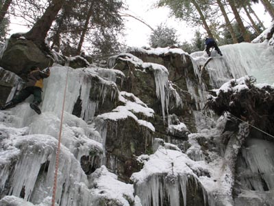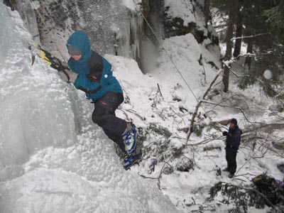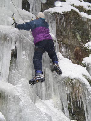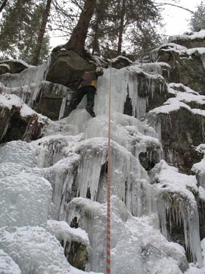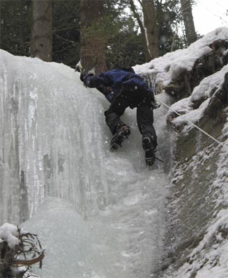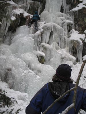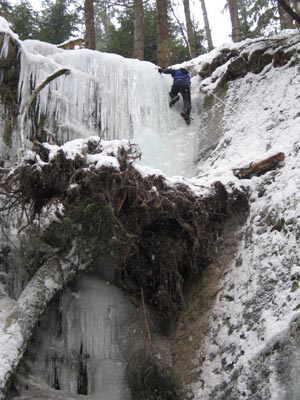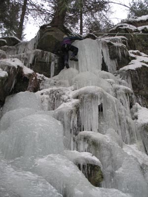 Pro fajnšmekry je to mizerných cca 12m kolmého ledu, který bývá suchý jen po ránu, jistí se tam pořádně shora za stromy, bez problémů mohou současně lézt 2-3 lezci, přístup je tam pohodlný po rovné cestě asi 2km od vesnice, kde může dojet auto a kde stojí hospoda... prostě nuda nuda šeď šeď.