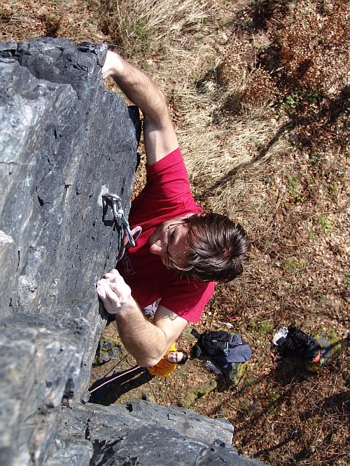 Eutanasie, 8- po hraně, dole celkem lehce a závěr přes větší převis vpravo od koutečku.