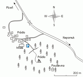 Do obce Prádlo (u Nepomuku) přijíždíte-li z Plzně dobočíte hned na první odbočce , která slibuje nějaké to prádlo a asi po 1 km dojedete do centra obce v mírné levotočivé zatáčce je odbočka doprava do kopce po ní vyjedete ještě několik desítek metrů. Až zaparkujete na vhodném místě (u hřiště nebo až u lesa, nechte volný průjezd lesním strojům.)