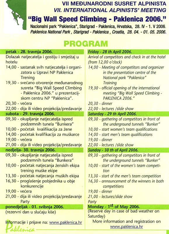 História tohto závodu nie je veľmi dlhá, traduje sa od roku 2000 a dnes je to v poradí siedmy závod. Siedme Medzinárodné stretnutie horolezcov "Big Wall Speed Climbing – PAKLENICA 2006." Bude obsahovať mnoho prednášok, premietanie diapozitívov a filmy o big wall lezení. Stretnutie je od 28 apríla do 1 mája 2006.