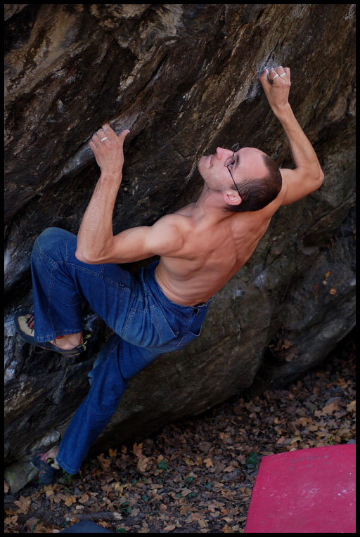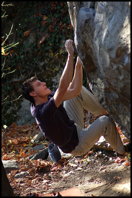 Hned zpočátku je třeba říci, že Branson není co do velikosti žádnou megaoblastí. Když už jsme jednou začali s přirovnáváním k oblastem známým z Čech, budeme v tom pokračovat. Byli jste někdy na Radči? Ne? Tak si tam zajeďte a budete tušit, co vás čeká v Bransonu. Tři buližníkové bloky, dva pod, jeden kus nad parkovištěm. Pokud vyrazíte z parkoviště dolů, hned po pár metrech dorazíte k prvnímu bloku, kde najdete několik lehčích boulderů na rozehřátí. Přímo s ním pak sousedí ten správný kámen, kvůli kterému jste sem nejspíš přijeli. Blok je sice poměrně velký, nicméně bouldery vedou pouze z jedné, převislé strany. Uprostřed Radja, s pekelným krokem za spoďákovou kostičku, hned vedle La Danse, se svými několika variantami nástupu, z nichž jedné se říká česká. Dobrou reklamu nám zde totiž dělá Kuba Čermák a spol., který zde již delší dobu působí. Tyto dva bouldery jsou orámovány dalšími čtyřmi ve stupních 7C - 8B. Lezení je zde příjemně komplexní. Lišty střídají boule, skoky, v jednom z boulderů je dokonce krátká spára. Vzhledem k jejich délce si i docela pěkně zalezete. La Danse je také možno lézt ze stoje jako 7C.