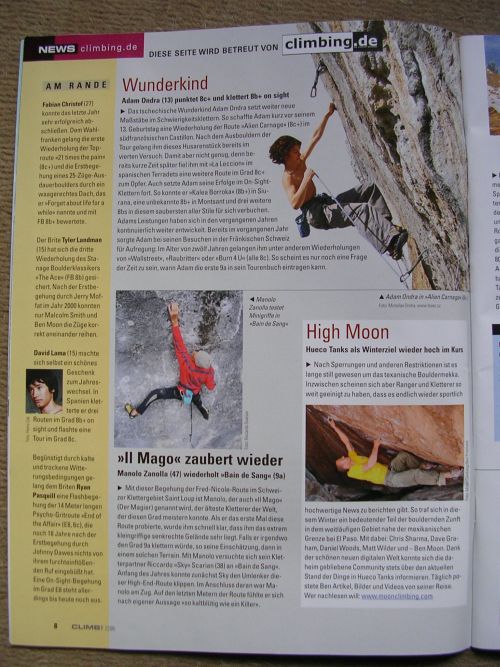 V druhém čísle nového německého časopisu o sportovním lezení Climb! věnují úvodní článek zpravodajské části "zázračnému dítěti" Adamovi Ondrovi a jeho letošním přelezům 8c+ a onsightům 8b+.