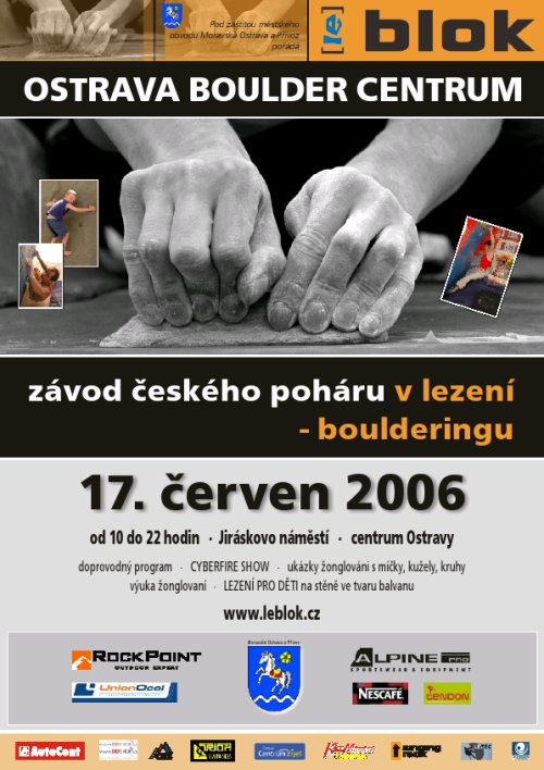 kde se celá akce za 14 dní to jest 17. 6. uskuteční. Poleze se na věži bratrů Repčíků, s novými žíněnkami! Kvalifikace začne v 10:00 a finále v 19:00. Čekají na Vás bohaté finanční (1.místo 5.000,-,2.místo 2.000,-Kč,3.místo 1.000,-Kč - muži i ženy) i věcné ceny(až do 5. místa). Další a podrobnější informace naleznete na stránkách www.leblok.cz.