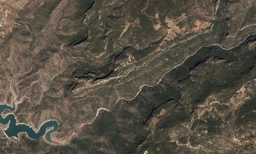 Další oblast je opět z o trochu větší výšky, proto možná chybí některé pro orientaci nepodstatné detaily, na druhou stranu se sem vešly důležité struktury, podle kterých lze oblast bezpečně identifikovat. Snímek je opět otočen severem hore a mimochodem jsou na něm oblasti hned dvě. Ta v centru, co nás zajímá, je tam však celá.