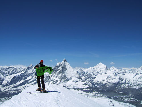 Lanovka na Klein Matterhorn (3883 m, 54 CHF) byla plná Japonců, kteří měli na rozdíl od nás velkou radost z arktických poměrů, které panovaly u východu z tunelu. Naštěstí po přechodu otevřené pláně se vítr trochu utišil. Výstup na Breithorn (4164 m) není obtížný, údajně je to jedna z nejpřístupnějších alpských čtyřtisícovek (pokud opláčete ty prachy za lanovku). Na vrcholu Breithornu jsem rozvinul nesmyslně velký transparent Hudy sportu, abych získal poukázku na deset litrů, i kdybychom v té Bolívii nikam nevylezli.