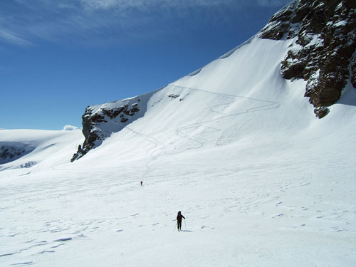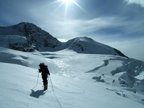 Pak už jsme se jen museli donutit vystoupat nahoru ke stěně Poluxu, abychom mohli pohodlně sjet dolů k chatě Ayas. Zezdola se ukázalo, že původně přitažlivější přímá cesta by vedla přes nebezpečně vypadající séraky. Tuhle zkušenost jsme udělali za čtyři dny našeho výletu ještě několikrát - v západních Alpách je lepší vědět kam jedete, jinak můžete skončit v naprosto neprůchodném terénu.