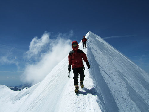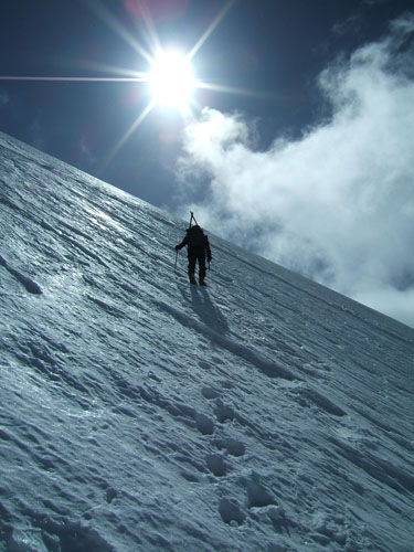 Druhý den nás čekal výstup západní stěnou na severozápadní hřeben Castoru, po kterém jsme chtěli vylézt na vrchol Castoru (4228 m). Bohužel vrcholek Castoru byl naprosto modrý vodní led, a vytahovat lano a vývrtky se nám nechtělo, takže jsme se otočili 20-10 metrů pod vrcholem.