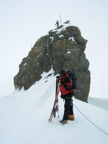 Na sedle jsme nasadili lyže a houstnoucí mlhou jsme sjeli prudkými svahy dolů na ledovec. Přestože se viditelnost stále zhoršovala, mířili jsme kolem Balmenhornu na Lisjoch, a chtěli jsme ještě ten den sejít na Monte Rosa Hütte. Bohužel počasí nebylo na naší straně, a poté, co jsme při nulové viditelnosti chvíli vyčkávali, zda se to protrhne, jsme se dramaticky vraceli na Balmenhorn. Ten jsme sice našli prakticky bez problémů (díky GPS a Mirkově skvělému orientačnímu smyslu), ale následovala scénka jako z Mrazíka - ke mně vchodem, k lesu zády.