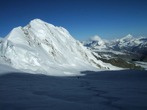 Po špatných zkušenostech, které jsme zaznamenali čtrnáct dní před tím na Bernině, kde jsme se do 3 500 m nepotkali se sněhem, jsme se tentokrát rozhodli nenechat nic náhodě a zvolili jsme oblast Monte Rosy, s vrcholy přes 4 000 m. Původně jsme chtěli vyrazit z italské strany na chatu Gnifetti, ale po krátkém probrowsování sítě jsme zjistili, že na italské straně už sezóna skončila a žádné lanovky nejezdí. Nezbylo nám, než zvolit přístup z dražší, švýcarské strany z Zermattu. Tam zřejmě sezóna nikdy nekončí, díky neustávajícímu proudu japonských turistů.