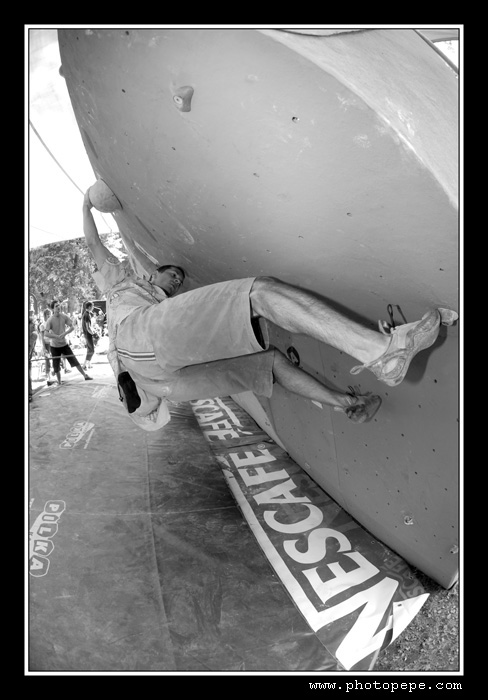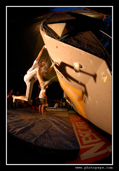 U kluků se ovšem tradičně strhl lítý boj a velmi smolně nepostoupil Majkl Fišer, který doplatil na tvrdé pravidlo dvousekundového držení topu, což ho stálo další pokus a tudíž jasné finále. Překvapením večera pro všechny bylo i nepostoupení Milana Řeháka. Do finále stačilo zakousnout se do dvou topů. Na čtyři topy se prodralo celkem  pět borců mezi nimiž dominoval Ján Honza Smoleň, který vše dal na OS. OS samozřejmě jak všichni už víme neexistuje, ale v závodním slangu se stylu, kterým závodníci dají boulder na první pokus, se tak prostě říká :))). Diváci už během kvalifikace dávali o sobě vědět a okolo závodní scény se jich rozestoupil úctyhodný počet. Dalo se už tušit, že blížící se finále bude mít ty správný grády a že se všichni mají na co těšit. Musím opravdu vyzdvihnout roli diváků, protože byli fantastický. Na finále se jich sešla hromada a jejich povzbuzování, hrnutí lezců vpřed a následný aplaus nemělo chybu! A to se samozřejmě odrazilo i na finalistech, kteří ze sebe vymáčkli to nejlepší a viděli jsme přelezy a pokusy nevídané :).