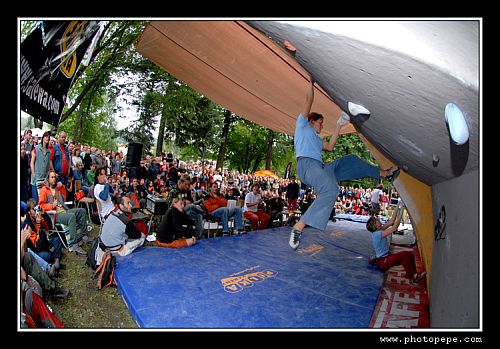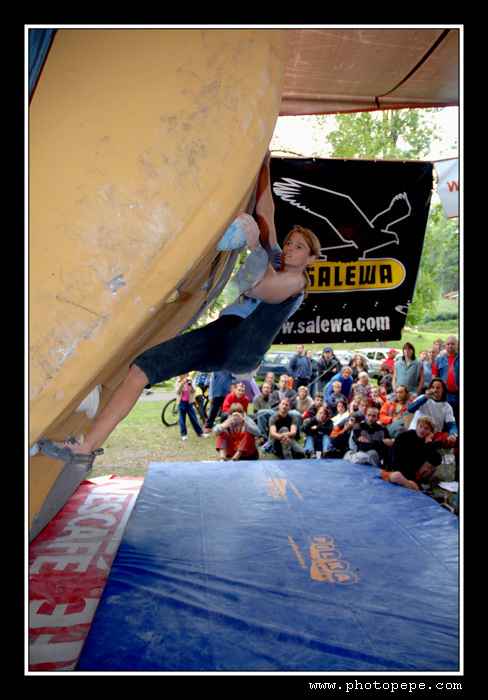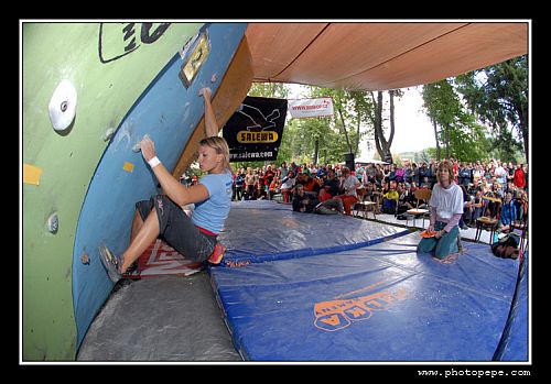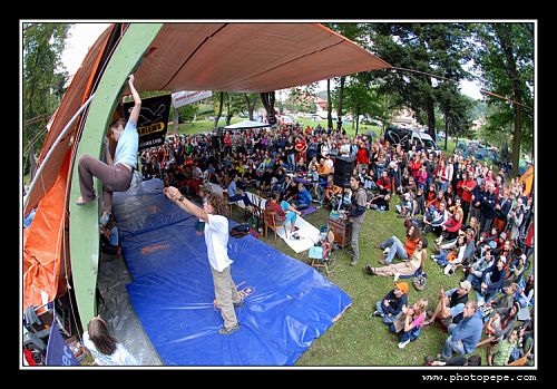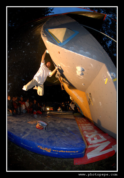 U holek o pokus na zonu a pokus na top vyhrála Věra Kostruhová s celkovými třemi topy. V těsném závěsu se na bednu prolezla Nelly Kudrová a na třetí stupeň si stoupla Silva Nagyová, která jako jediná ze zbylých finalistek omaglajzovala jeden top oběma rukama najednou. Bohužel do finále nenastoupila Lucie Lu Klemšová, která si v prvním boulderu v kvalifikaci blbě odskočila a bolest se projevila až před finále. Mužské finále bylo jedním slovem MELA! Dlouho jsem už nezažil, tak strhující finále.Diváci byli natolik fantastičtí, že se mi celá podívaná vryla hodně pod kůži. Doubravák byl před finálem sice trošku nervózní z toho, že neměl dva bouldery vyladěný, ale nakonec se ukázalo, že byly přímo vybroušený. Na prvním boulderu hned pobavil diváky Jarda Straka Balboáč, který jaksi zakotvil na záchodě o trošku déle než měl a v první minutě svých pokusů se ještě převlékal a obouval na matracích :). Možná i právě proto se propadl na poslední 12.místo. Vtipně to komentátor okomentoval, že Balboáč ten závod tak trošku pros…