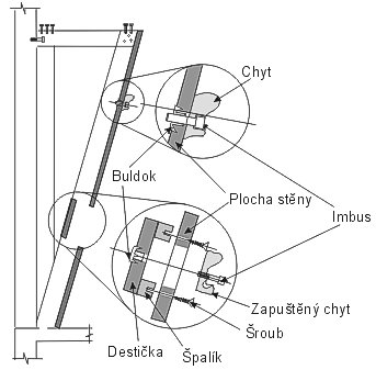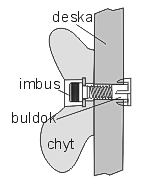 Každý chyt je přišroubován 12 mm imbusovým šroubem do tkz. buldoku. Což je matka s ozuby , které se zakousnou do dřeva. Buldok je natrvalo zatlučen do zadní stěny desky. Chyt je pak možné lehce upínat odendávat uvolňovat otáčet a vůbec modifikovat podle přání. Dej jen pozor a utáhni ho akorát, aby se neprotočil a ani nepraskl.