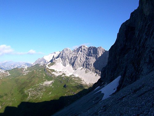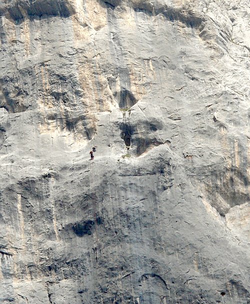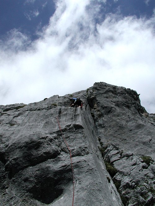Dodělá nás dýlka za 8-, kde některé kroky moc osmmínusku, ba snad ani osmu nepřipomínají, a také představa, že nahoře je to ještě těžší... Ještě máme v hlavě včerejší otázku: "Ondro jak je to jištěný?" a odpověď: "Hm, dobře, jako na písku?." Na štandu na sebe s Járou mrkneme a jedeme dolů. Samozřejmě si dole nadáváme, jaký jsme sračky a že jsme to měli ještě zkusit. Asi je ale někdy lepší zapéct cestu, než ve stresu udělat nějakou fatální chybu (vzpomeňme na velkého učitele).Nicméně přísaháme na rätikonskou kamennou kočičí pracku, že až trochu potrénujeme, tak se na tuhle cestu ještě jednou vrátíme. Údolím se zatím nese řev vítězství. Ondra dolezl Silbergeier. (Gratuluji !!!, ale taky nechápavě kroutím hlavou a přemýšlím, kde jsem za posledních čtyřicet let udělal chybu v tréninku).