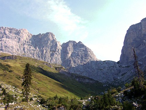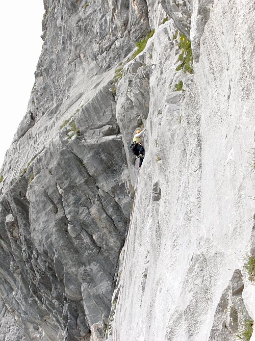 Abychom si spravili chuť, na poslední den vybíráme lehčí cestu Haldenjohli,. Jsem už docela jetej, takže se mi snad ani moc nechce a ještě ta první hnusdýlka. Fuj. Jenže pak už nás pohlcuje další nádherné lezení a maximálně si užíváme. Je to klasická cesta sledující spáry na vrchol 5. věže Kirchlispitze, ale jak jinak, rajbasy se tu samozřejmě najdou také. Jsou tu jen dvě těžší dýlky, jedna za 7- a druhá za 7. V těch lehčích to pak chce zakládat co to dá. Trošku už nám hrozí počasí, je vidět, že se to sbírá na bouřku a je fakt teplo, ale v dobrém čase "haldenjohdlujeme" na vrcholu. Tentokrát slaňujeme na sever. Máme s sebou botky, takže pěšmo mastíme přes Schveizertor k autu. Když koukám na oblohu slibuji, že hodím dvacku v Bartoloměji do kasičky, když mě ten nahoře nechá za sucha uvařit a najíst, ale káplo mi na lžíci, ještě jsem neměl úplně dojezeno, takže panáček nic nedostane. No a jelikož bouřky už jsou tu, je čas na odjezd. I kravičkám je líto, že už musíme, natož nám.