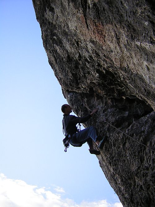 A ještěk přelezu. Bohužel se před vlastním traverzem dá oddáchnout v koutu Fotogenické (a je nelogické předepisovat, že se tam nesmí), cvaknout ze strany trochu prodlouženou expresku v borháku a pak si to valit zhruba pěti boulderovými kroky po trochu bolesivých lištách s parádním závěrečným skokem. Během celého boulderu se necvaká, což je určitě dobře.