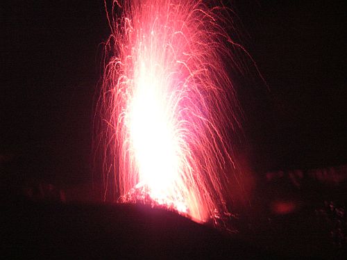 Cesta nahoru byla celkem schůdná po vyšlapaném chodníku a traverzem, takže žádné lezení po čtyřech. Česká výprava udržovala celkem svižné tempo, ale povinní průvodci zastavovali a dělali příliš dlouhé zastávky, takže člověk nepříjemně vychladl a to vše kvůli francouzům, kteří se táhli jak smradi a vůbec nestíhali. Na pozorovací místo jsme dorazili se zpoždění, ale sopka se nám odvděčila krásnými erupcemi, které od nás byly jen několik metrů. Sopka nejde naprogramovat nebo nějak přimět k efektům a proto je štěstí vidět takovéto erupce.