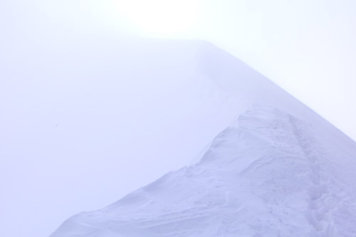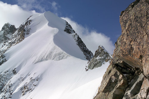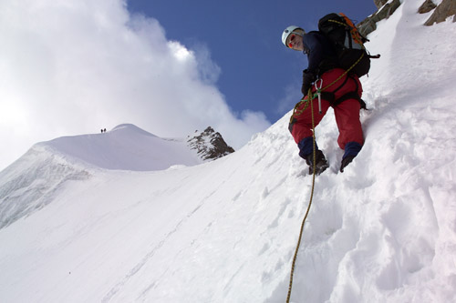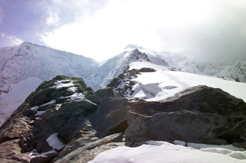 Někdy je hřeben úzký pouhý půlmetr, posléze se trochu rozšiřuje, aby se ve střední části proměnil ve strmý ledový výšvih. Na šrouby to ale není, jen si to chce, jak všude správně píší, dávat pozor, kam člověk šlape. Takže fyzicky pohoda, psychicky poměrně náročná záležitost. Jak se blížíme k předvrcholu Piz Bianco, kterému do čtyř tisíc chybí pouhých pět metříků, počasí se začíná poměrně rychle měnit k horšímu.