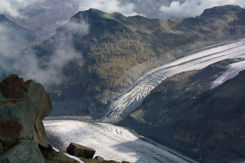 Pak už jen slanění hřebínku Fortezza, kde se naše stíny promítnou do mlžného oparu a kolem hlav se nám vytvoří duhová svatozář, a o hodinku později už bez maček navázáni na jedno lano "sbíháme" rozbředlý ledovec Fortezza směrem ke skalám nad ledovcem Morteratsch.