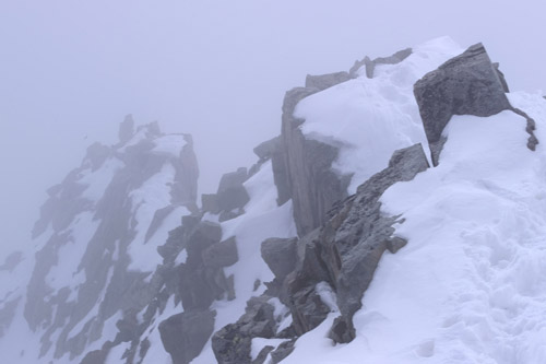 Na vrcholu Piz Bianco panuje už ta pravá bílá tma a na návětrné straně to nepříjemně fouká. Na nějaké vylepšení to nevypadá, a tak nedůvěřivě štandujeme do prvních délek skalního hřebínku k samotnému vrcholu Piz Bernina. Tenhle oříšek by za "ranního" počasí byl jistě příjemným zpestřením, ale teď, když není vidět skoro na krok, prudce se ochladilo a duje nepříjemný zápaďák, to zas taková dávačka nebude.