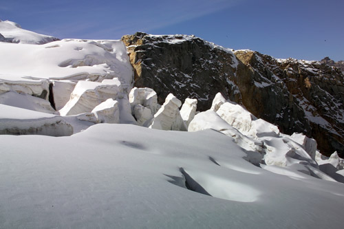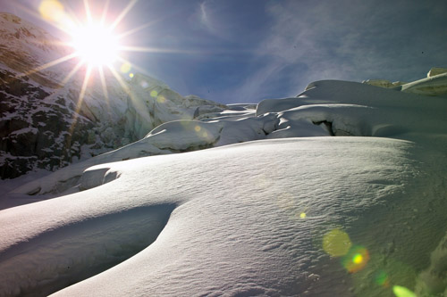 Jdeme úplně nalehko, Jirka má džíny, kšiltovku, batůžek, sedák a pak...už nic. A proč taky, cesta na Piz Palü se od loňska výrazně nezměnila, vše je přimrzlé, zkrátka pohádka. Pohodovým tempem vystoupáme nad sérakovou hradbu a v polovině výstupu na Palü to po výživném (podle Jirky proso) obědě obracíme. Času máme až až, takže fotíme a já na plochém místě ledovce vytahuju talíř na frisbee...
