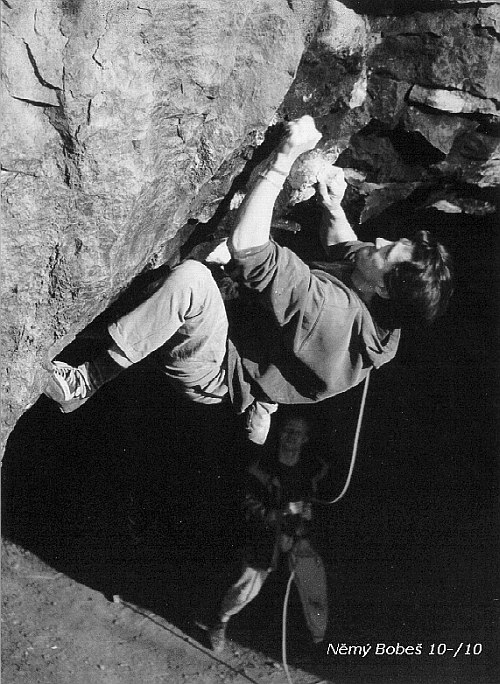 Brzy po těchto nesnadných úpravách (dávat borháky do stropu je vůbec hrozná legrace) jsme se dostali i k prvním přelezům. Nejdřív vznikly „Uhelné prázdniny“ (9+/10-), pěkný bouldrový výlez ze stropu, přelezený v těsném sledu oběma bratry Reschovými, brzy na to i Karlem Hegrem. Následoval „Němý Bobeš“ (10-/10) s tvrdým boulderm na začátku, lehkým stropem a výlezem „Uhelnýma prázdninama“, které Rosťa Štefánek sám o sobě označil někde (asi v žertu) za 8b. Dlouho odolávala klenba, ale přece jenom jsme i tu ještě zjara udolali, název „Mrtvej tah“, klasifikace asi nejbouldrovější 10-, které jsem kdy lezl.