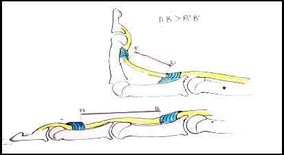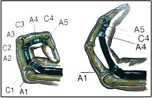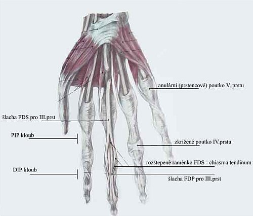 Fibrózní část kanálu na prstu zahrnuje 5 prstencových poutek. Prstencová poutka představují důležité struktury fixující šlachovou pochvu ke kostěnému skeletu. Při destrukci některého z těchto poutek vzniká různý stupeň tětivy flexorových šlach. Mezi prstencovým - anulárním poutkem a nad ním ležícím kloubem se nalézá zkřížené poutko, které je membranózní a tak flexibilní, že se roztahuje a kontrahuje s pohybem. Spodinu prstového kanálu tvoří přední strana článku prstu (falang) a přední strana destičky metakarpofalangeálního (MP) kloubu a interfalangeálních kloubů. Zlomeniny a macerace destiček působí přímo na klouzání šlach.
