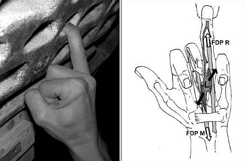 Plné přetržení není častým zraněním, nicméně si je lze přivodit např. při pokusu zabránit pádu nebo při zvedání se na nejmenších chytech. Může se ozvat prasknutí a prudká bolest v průběhu šlachy na prstu, obvykle v místě, kde se šlacha m.flexor digitorum profundum upíná na poslední článek III.-IV. prstu.