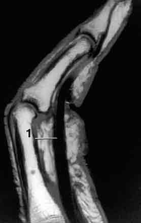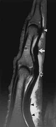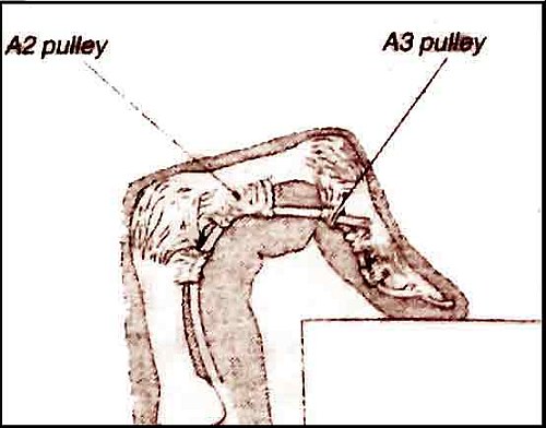 Zánět je charakterizován otokem bříšek prstů, na NMR je vidět hromadění tekutiny, vyšetření ultrazvukem prokáže "halo fenomén" kolem šlachy.Výskyt "chronických otoků prstů" je syndrom vyskytující se často u mladých lezců: podkladem je hypertrofie, chronický zánět synovie a ztluštění kloubních struktur.