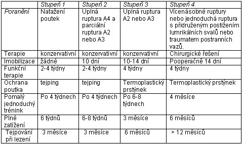 Šlachu je nutno přišít nejpozději do 3 týdnů, avšak čím dříve, tím lépe. Nejméně 6 týdnů trvá zdánlivé obnovení pevnosti šlachy (tím se myslí strukturální, nikoli však funkční obnovení pevnosti). Ve skutečnosti je nutná přestávka v lezení nejméně 3 měsíce, chceme-li se vyhnout velkému riziku obnovení zranění.