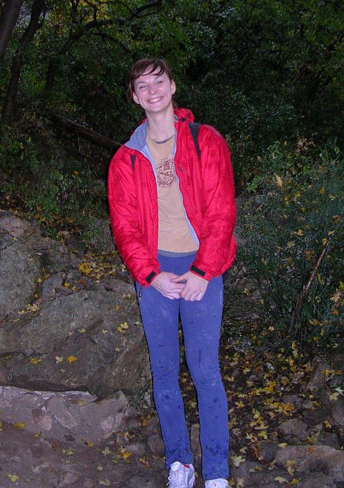 Silva Rajfová (17 let) pod skalami v Mišja peči. Včera už nic pořádného nevylezla. Po závodech Světového poháru a sobotní Marionetě přišla únava, ale ani vytrvalý déšt jí včera radost z prvního 8b/b+ nezkazil