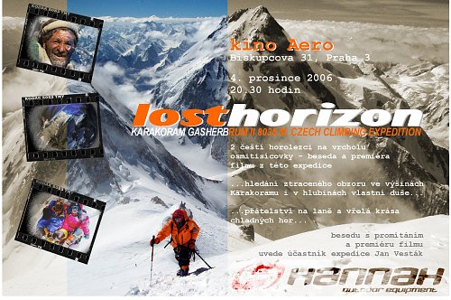 Námětem pro letošní expedici Jana Vestáka a Jana Krabce byl slavný román Jamese Hiltona Ztracený obzor o hledání utopického ráje na zemi. Přijďte se zúčastnit hledání tohoto ztraceného obzoru ve výšinách karakoramských štítů i v hlubinách vlastní duše. Svět osmitisícových vrcholů, drsně krásná krajina Karakoramu, splněné klukovské sny, přátelství na laně, optimismus horolezectví a úspěšný výstup na jeden z nejvyšších štítů planety...