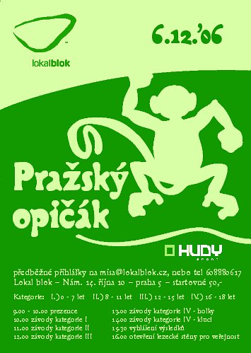 Znovu po půl roce, 6.12.2006, se v Lokal bloku uskuteční boulderové závody pro děti a mládež do 18ti let PRAŽSKÝ OPIČÁK.